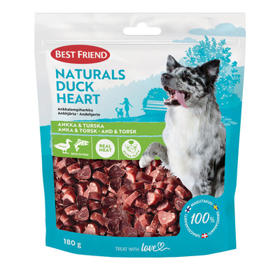 Sammensætning: And (63,89 %), torsk (14,6 %), ærteprotein/erteprotein (8,5 %), glycerin/glyserin (7,2 %), tapiokastivelse (5,7 %), salt (0,1 %). Tilsætningsstoffer/tilsetningsstoffer: Sensoriske tilsætningsstoffer/tilsetningsstoffer: EU godkendte/godkjente farvestoffer/fargestoffer (0,01 %).