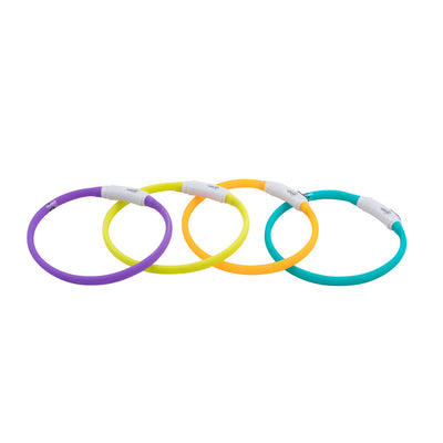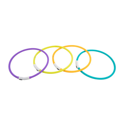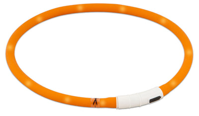 Lysbåndet må ikke fastgøres til hundesnoren. Katten må ikke slippes ud alene med et lyshalsbånd på. Båndet må kun bruges i overensstemmelse med denne vejledning. Hvis du overlader produktet til andre, skal du sørge for, at vedkommende kender til vejledningen og har sat sig ind i, hvordan båndet bruges korrekt. Børn må kun bruge det under opsyn af en voksen. Beskyt produktet mod varme og slag udefra eller fra at falde af, da det kan blive ødelagt. Produktet er egnet til brug ved temperaturer på mellem -20° og +40° C. Kontroller altid, hvordan produktet fungerer, før brug. Batteriet må kun oplades efter anvisningerne, ellers er der risiko for kortslutning eller elektrisk stød (se de tekniske data). Hvis båndet går i stykker eller bliver gennemvædet, så der kan trænge vand ind, skal det tages ud af brug eller kontrolleres af en elektriker, før det bruges igen. Brug: Læs brugsanvisningen grundigt igennem. Tag produktet forsigtigt ud af emballagen. Tilslut USB-kablet til båndet og USB-porten f.eks. på en computer (1). Lyset i LED-lysbåndet slukker, når det er opladet helt (opladningstid ca. 1-1,5 time). Tag mål af hunden omkring halsen med et målebånd eller ved at prøve med båndet. Båndet må ikke gøres for stramt, så der skal være plads til mindst to fingre mellem båndet og hundens hals. Klip båndet i en passende længde mellem LED-lysene i den ende, som er angivet på billedet med en saks (2). Flyt enden af plastlåsen fra den afklippede del til den nye ende af båndet (3). Nu er lyset klart til brug. Lyset tændes og slukkes ved at trykke på ON/OFF-knappen (4). Lyset kan med samme knap indstilles til at lyse konstant eller blinke. Lyset varer i ca. 2-4 timer uden genopladning, alt efter brug. Lyset kan ses på ca. 500 m afstand, afhængig af opladningen og faktorerne i omgivelserne.