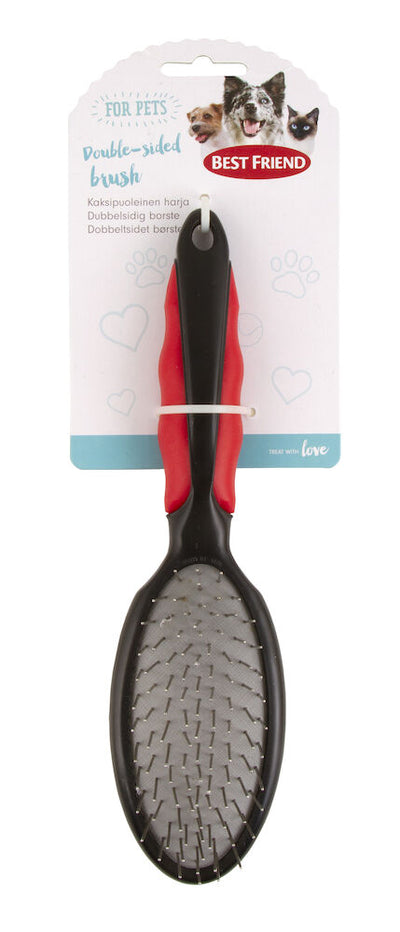 Best Friend kaksipuoleinen harja on monikäyttöinen, sillä samassa harjassa on yhdistettynä tavallinen ja metallipiikkinen harja. Säännöllinen harjaus poistaa likaa ja irtokarvoja, edistää ihon verenkiertoa ja estää turkin takkuuntumista. Harja soveltuu useimmille karvalaaduille ja siinä on tukeva, luistamaton kädensija. Harjan koko 25 x 6 x 6,5 cm.