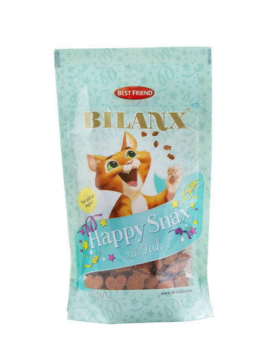 Bilanx Happy Snax Fish on kalanmakuinen, erittäin rapea ja maistuva vähäkalorinen herkku kaikenikäisille kissoille. Pussissa on kolmen kokoisia herkkupaloja. Herkkupaloissa ei ole lainkaan lisättyä sokeria ja energiaa vain 1 kcal / pala.