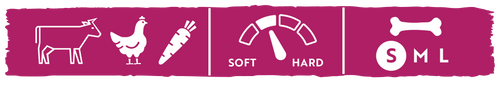 In the color bar of our renewed package, you can easily find the most important facts affecting the choice of chewing bone: ingredients, chewing power and bone size. These facts will help you choose the most suitable and delicious bone for your dog, according to the dog's size, chewing power and taste preferences!