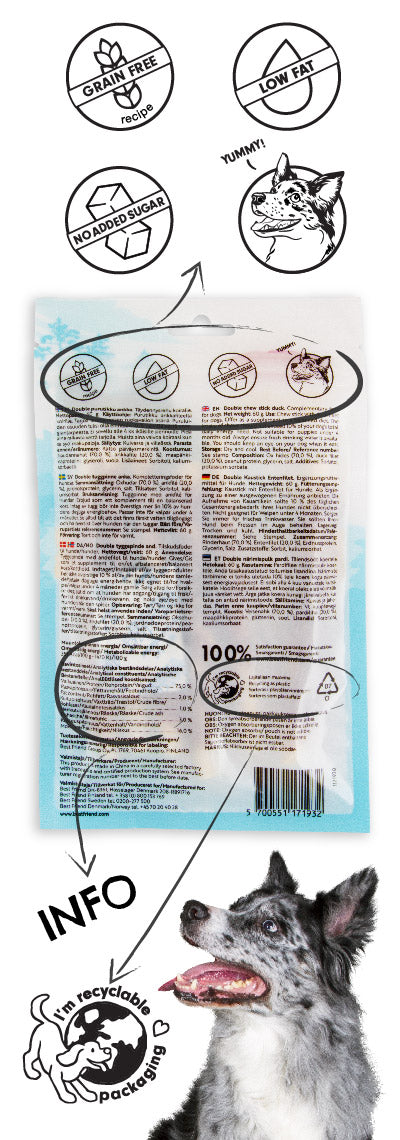 In the backside you can also find instructions on recycling the packaging as plastic, which makes it easy to recycle the empty dog chew bag correctly and responsibly <3