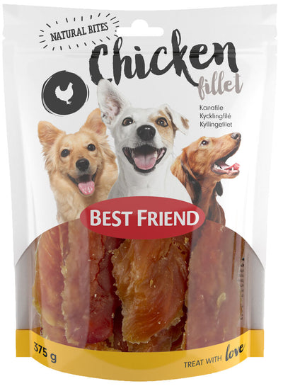 Best Friend Natural Bites Chicken Fillet are tasty, classic treats suitable for all adult dogs. The treats contain lots of protein and real chicken, but no grain. Convenient resealable pack.