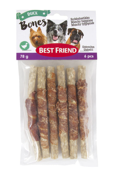 The Best Friend Bones munchy sticks, wrapped in real duck fillet, are chewable treats particularly suitable for smaller dogs, old dogs and puppies. Even though the texture of the munchy sticks is soft, they offer plenty to do for dogs that love to chew. The real duck fillet adds flavour and makes even the pickiest dogs get excited about chewing. The munchy stick with duck fillet is a tasty chew bone that is also perfect for larger dogs as a reward or treat. Regular use of chewing products helps maintain tooth and gum health and prevent bad breath. Chewing products also make for excellent entertainment and effectively invigorate your dog during dull moments while stimulating the natural chewing instinct.