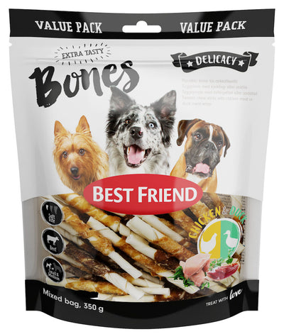Best Friend Bones Chew Sticks with Chicken and Duck Fillet are a delicious combination of premium cowhide and real duck fillet. Tough cowhide provides a suitable challenge for your dog’s teeth, and the tasty duck fillet activates the dog and makes even the pickiest individual get excited about chewing. Bones Chew Sticks with Chicken and Duck Fillet are easy to digest, as well as rich in protein and low in fat. These chew sticks are an excellent choice for small and medium-sized dogs with a low or moderate bite force. Due to the small size, the product is also perfect for larger dogs as a daily treat or reward. Regular use of chewing products helps maintain tooth and gum health and prevent bad breath. Chewing products also make for excellent entertainment and effectively invigorate your dog during dull moments while stimulating the natural chewing instinct.