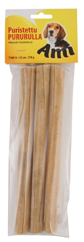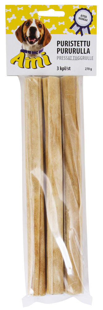 Ami pressade tuggrullar är gjorda av 100 % nöthud. Den höga kvaliteten är resultatet av enkla ingredienser och många års erfarenhet att av tillverka den här sortens godbitar. De noggrant tillverkade rullarna är en riktig utmaning för hundens tänder och ger större hundar med starka käkar en tuggupplevelse som varar länge.