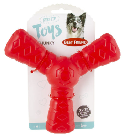 Den av tjockt och hållbart gummi tillverkade Best Friend Chunky-leksaken passar även för hårdare tuggare. Leksaken som utrustats med ett högt pipljud passar utmärkt för lite tuffare lekar både inne och ute och den är en väldigt bra leksak för exempelvis apportlekar. Storlek 17,5 cm. Färgsortiment. Hundar har ett medfött behov att tugga. Speciellt i valpåldern, när valpen byter tänder, är det viktigt att hunden får något säkert att tugga på. Att tugga rätt typ av leksaker förhindrar effektivt plack- och tandstensbildning och främjar tändernas och tandköttets välbefinnande även vid en senare ålder. Best Friend testar regelbundet sina leksaker för skadliga kemikalier. Husdjuret bör övervakas under leken och en trasig leksak bör tas ur bruk.