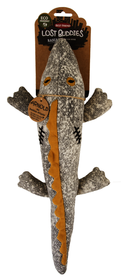 Best Friend Lost Buddies är en serie husdjursleksaker som tillverkats av återvunna, naturliga eller ekologiska material. Leksakens fyllning är återvunnen polyester. De speciellt utvalda naturliga eller återvunna materialen ger leksakerna en unik karaktär. I BF Lost Buddies-serien finns leksaker för såväl hundar som katter. I formgivningen av leksakerna har man beaktat inte bara de olika leksätten utan också hund- och kattägarnas olika leksakspreferenser. Best Friend Lost Buddies Rascals-mjukisdjuren är härliga att bära och kampa med! Den kan också tas som nattkompis. I leksakssortimentet, som passar för medelstora och stora hundar, finns olika figurer. Är någon av dem din hunds nya bästa kompis? Randy the Greedy Rat Roffarråttan: “Jag känner mig som hemma i stadens liv och rörelse och jag vet hur man undviker råttfällor. Ost är min absoluta favoritmat. Jag har varit ganska ensam på sistone. Skulle du vilja vara min nya Bästa Kompis? Jag har tillverkats av återvunnen PET-flasktyg och ekologisk bomull.” Leksakens höjd 25 cm. Arnold the Toothless Alligator Den tandlösa alligatorn: “En dag spolades jag ner i avloppet. Resan i rören var lång och skrämmande. Jag börjar bli gammal, nästan alla mina tänder har lossnat. Skulle du vilja ha en sådan här gammal veteran som din nya Bästa Kompis? Jag har tillverkats av återvunnen PET-flasktyg och ekologisk bomull.” Leksakens längd 45 cm. Best Friend testar regelbundet sina leksaker för skadliga kemikalier. Husdjuret bör övervakas under leken och en trasig leksak bör tas ur bruk.
