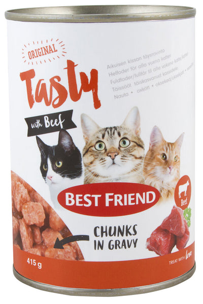 Best Friend Tasty Nötkött är ett helfoder för en vuxen katt, fodret innehåller läckert mjuka och köttiga nötköttsbitar i en välsmakande sås.