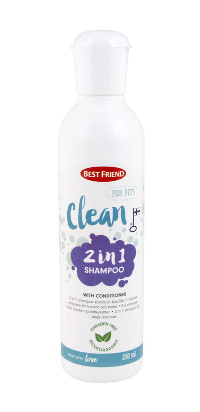 Det i Finland tillverkade, högkvalitativa Best Friend Clean Kaksi yhdessä-schampot passar såväl för hundar som katter. Det praktiska schampot innehåller även ett balsam som gör det snabbt och enkelt att tvätta ditt husdjur. Kombinationen av schampo och balsam gör pälsen blank, mjuk och lätt att kamma. Produkten är tillverkad av säkra och miljövänliga, biologiskt nedbrytbara ingredienser. Innehåller inte parabener. Flaskans storlek 250 ml. Nyckelflaggprodukt. Med högkvalitativa och säkra Best Friend-verktyg och -produkter är det enkelt att ta hand om ditt husdjurs päls och hud och samtidigt upprätthålla ditt husdjurs hälsa och välbefinnande.