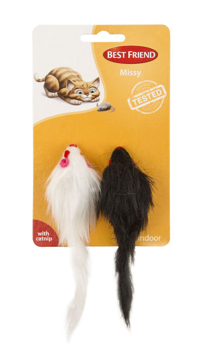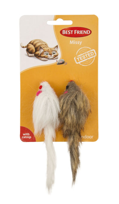 Katterna älskar de små Best Friend Missy-mössen! De fluffiga leksakerna som ser äkta ut och innehåller kattmynta väcker kattens medfödda jaktinstinkt. I förpackningen finns två små möss i olika färger, storlek 5 cm + svans. En katts lek baserar sig på dess medfödda jaktbeteende. När katten lurpassar leksakerna får katten förverkliga den instinktiva aktivitet som kännetecknar den. Att leka tillsammans stärker förhållandet mellan ägaren och katten, tränar kattens motoriska färdigheter och bibehåller god kondition hos katten. Best Friend testar regelbundet sina leksaker för skadliga kemikalier. Husdjuret bör övervakas under leken och en trasig leksak bör tas ur bruk.